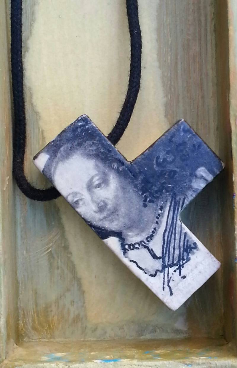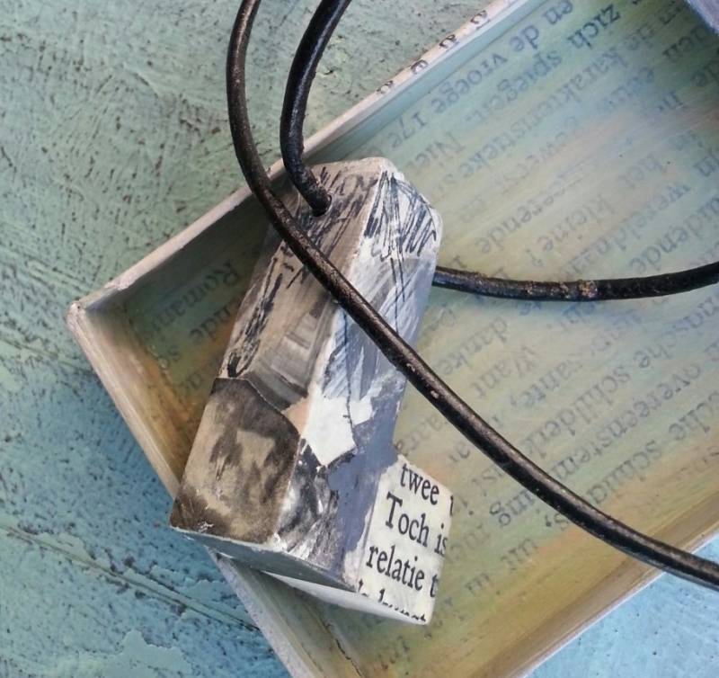 Kettingen gemaakt van houten blokjes en spoeltjes. Met een koord in leer of stof. Prentjes komen uit oude kunstboekjes. Er is 1 geheel van gemaakt door te schilderen en tekenen. Hanger is afgelakt met acrylvernis.